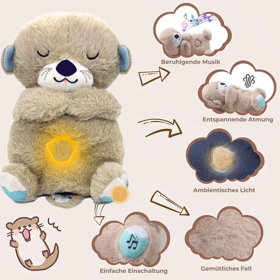 Kennst du das Gefühl, nachts nicht zur Ruhe zu kommen? Einsamkeit, Unruhe oder Schlafprobleme rauben dir oder deinem Kind den erholsamen Schlaf? Unser atmender Otter schenkt dir ein Gefühl von Geborgenheit & Nähe, als würdest du mit einem echten Begleiter einschlafen. Seine sanften Atembewegungen, beruhigenden Geräusche und das warme Licht helfen dir, schneller in einen tiefen, entspannten Schlaf zu finden.